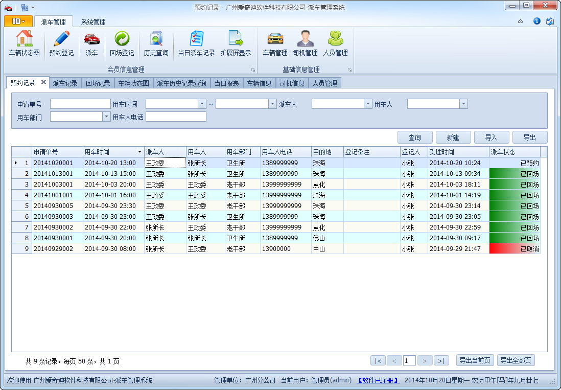 軟件包含預約、派車、回場等過程,綜合了對車輛、司機、使用人員、數據字典等綜合信息的管理,能夠方便實現車輛的派車調度處理,系統可以打印派車單、車輛統計等報表,以及支持把預約和派車信息顯示在幕墻或者擴展屏幕上,非常方便操作和管理。